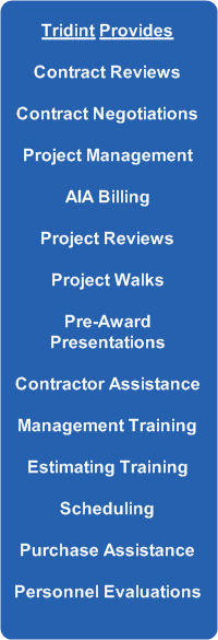 Tridint Construction Contractor Services is not an attorney, we are construction consultants that deal with your problems everyday of our lives. Tridint provides assistance and services to contractors and subcontractors. We provides a range of solutions for the startup contractor to the most seasoned firms. Depending on your experience level, each contractor has its own special requirements. We specialize in filling those requirements by becoming your backdoor operation, allowing you to concentrate on your field. Instead of hiring your own unknown fulltime office staff, why not save money by allowing Tridint to perform these functions.